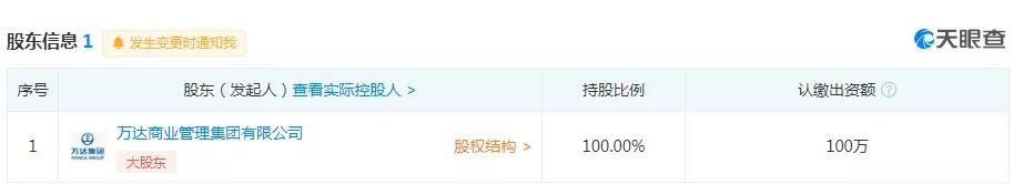 该公司是由万达商业管理集团有限公司100%控股的。据了解,万达商业管理有限公司是大连万达集团的核心子公司之一。也是中国最大的全国性连锁商业经营管理企业。