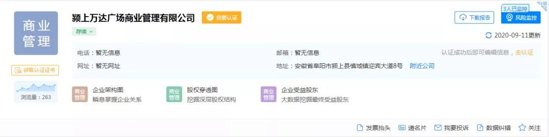 目前万达已于9月4日在颍上注册颍上万达广场商业管理有限公司!