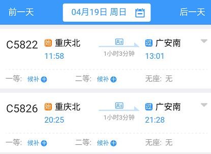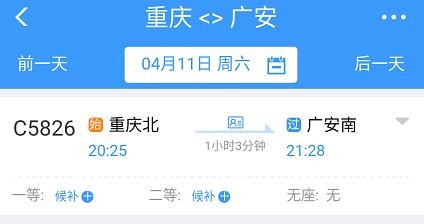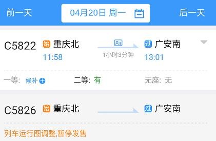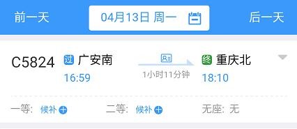 广安南站到重庆北站动车4月13日期恢复运行,为C5824次列车,下午16:59发车,耗时1小时11分钟。