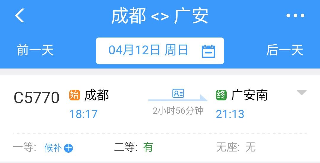 成都站至广安南站为C5770 次列车,耗时2小时56分钟。