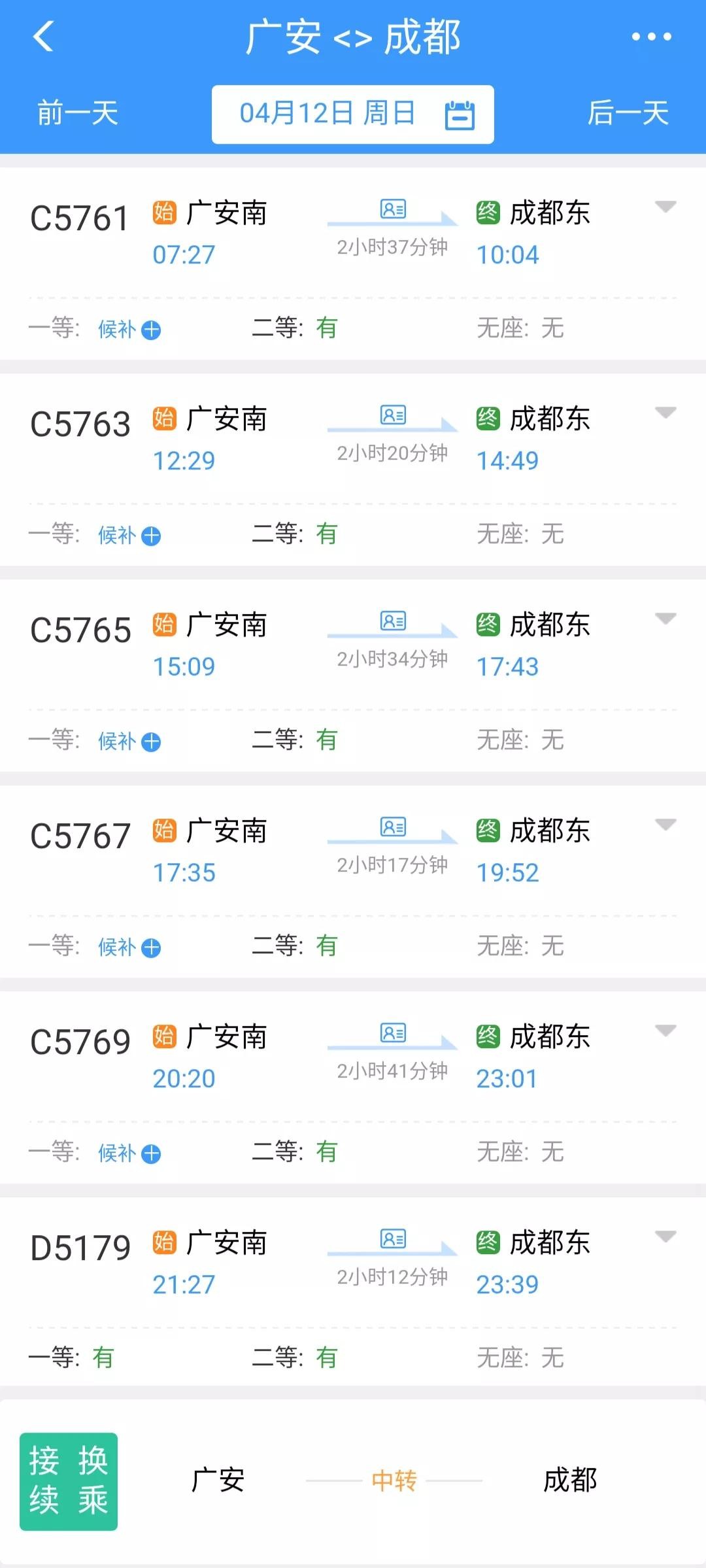 其中,广安南站至成都东站分别为C5761、C5763、C5765 、C5767、C5769、D5179等班次,单次运行时长最短为2小时12分钟,运行时长最长为2小时41分钟。