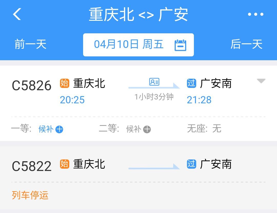 4月1日,铁路12306官方软件显示,4月12日起,广安南站至成都(东)站动车增至7个班次;4月13日起,成都(东)站至广安南站增至8个运行班次。广安南站至重庆北站动车4月13日起恢复1个班次运行。