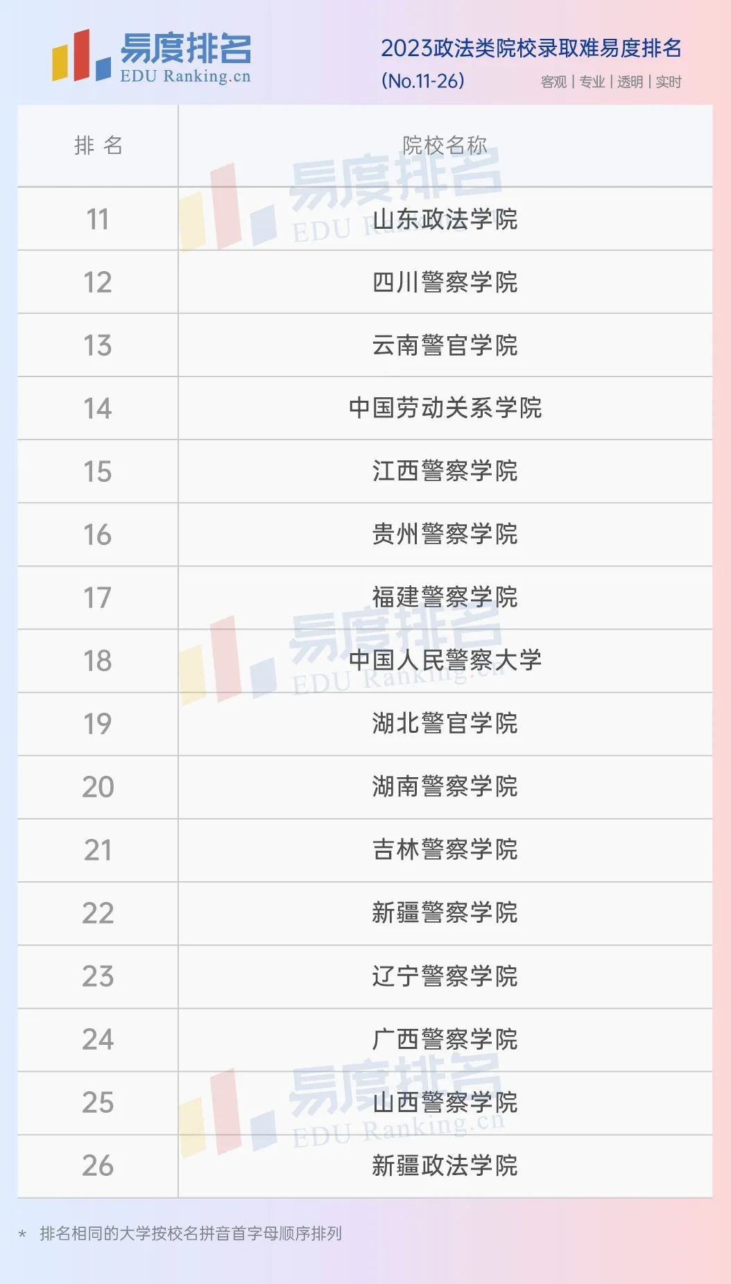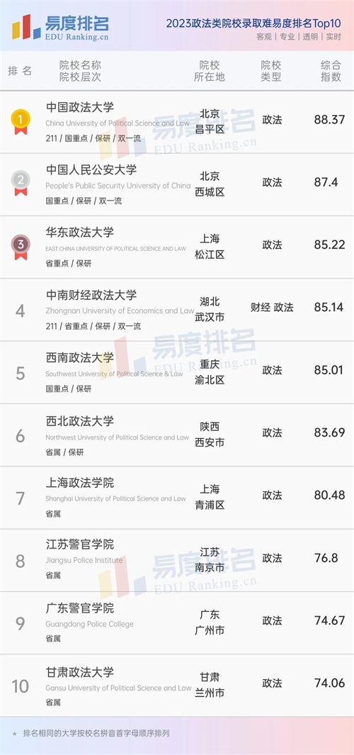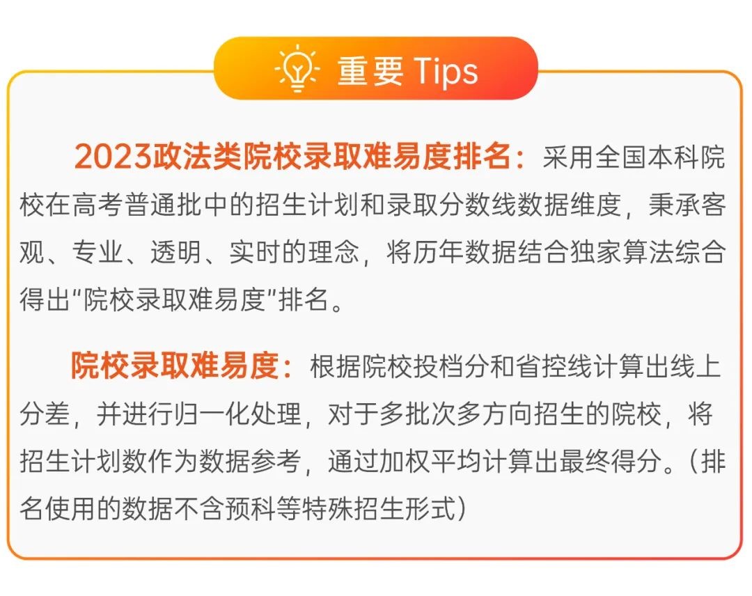 本期易度排名将公布“2023政法类院校录取难易度排名”全部排名。(具体排名方式见文末)
