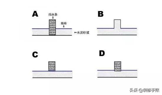 D.水泥砂浆铺好后,铺地砖时留出一条槽再放入挡水条。较A更容易更换,但是角缝处理必须要做防水,还要带胶,否则等于没装,还容易漏水。