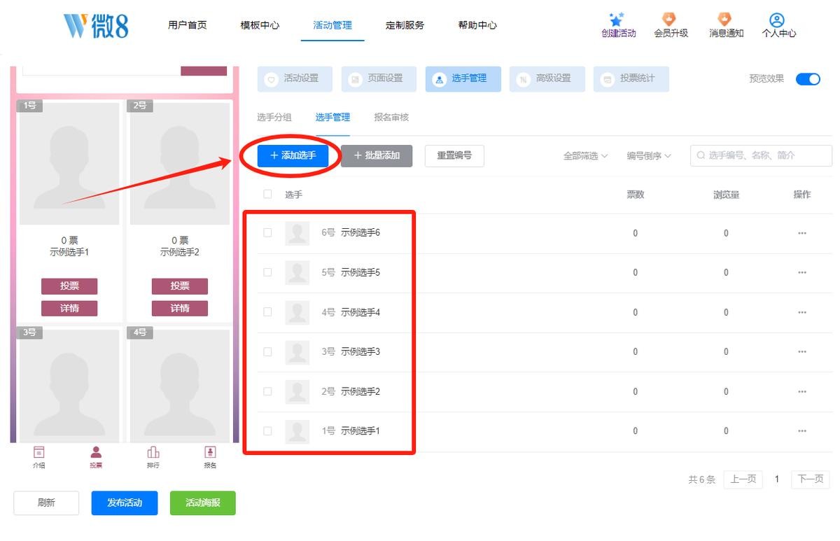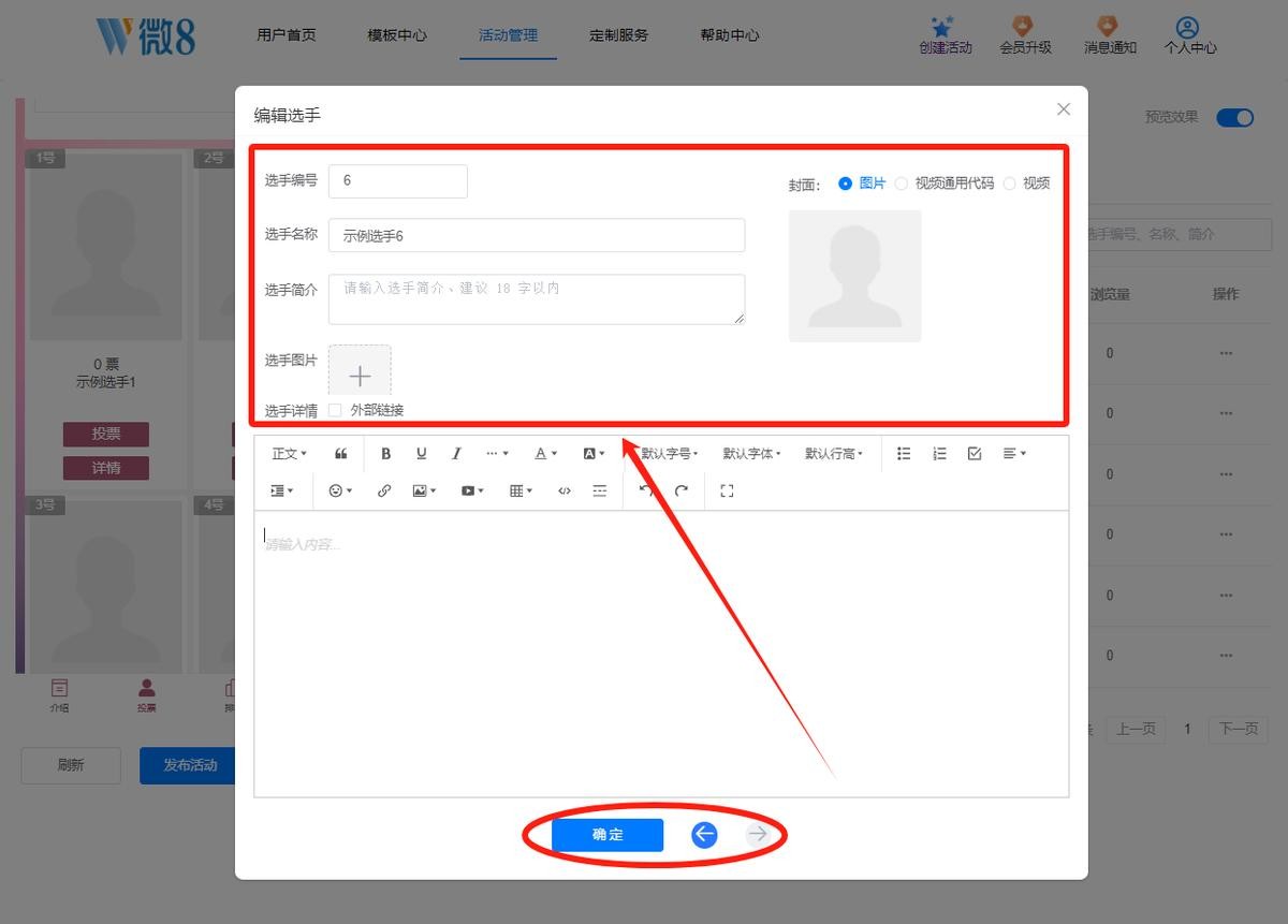 在选手管理界面,点击“添加选手”按钮,在选手编辑框内按提示上传入围妈妈们的相关资料。