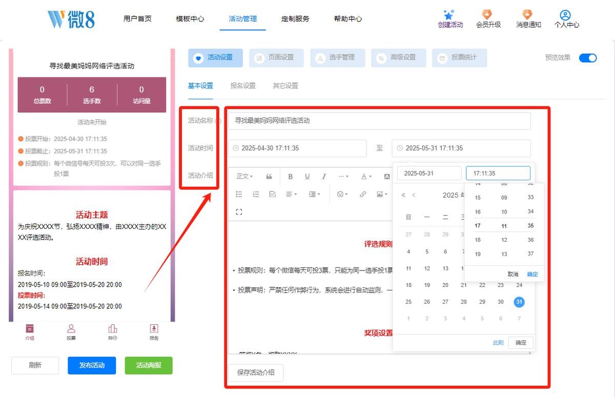 接着,输入活动基础信息,包括主题名称、活动介绍(详细说明活动目的、规则、投票时间等)、投票时间(精确设置开始和结束时间)。