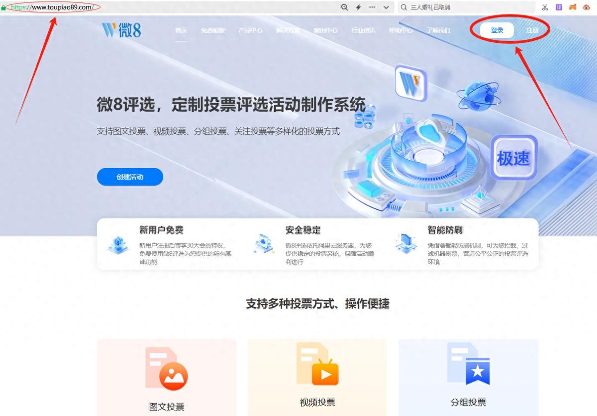 先在任意浏览器中输入网址www.toupiao89.com,进入微8评选-免费微信投票制作平台-网络评选制作系统-公众号投票创建平台首页后,注册账号并登录。