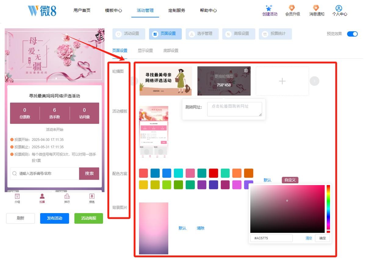 然后,在页面设置中上传活动封面图(选取温馨感人的母爱主题图片)、调整配色方案,添加边框、漂浮物等元素。