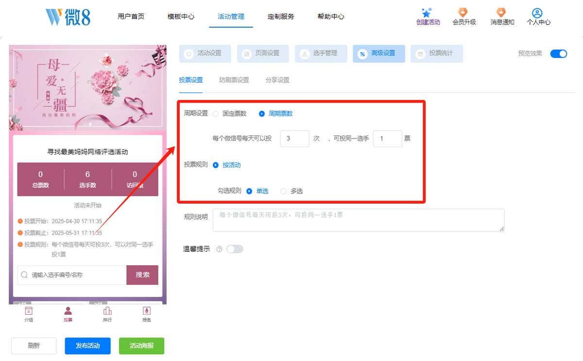 在高级设置界面,设置投票次数(设定每个用户每天或整个活动期间的投票次数)以及是否允许多选(根据活动需求决定)。