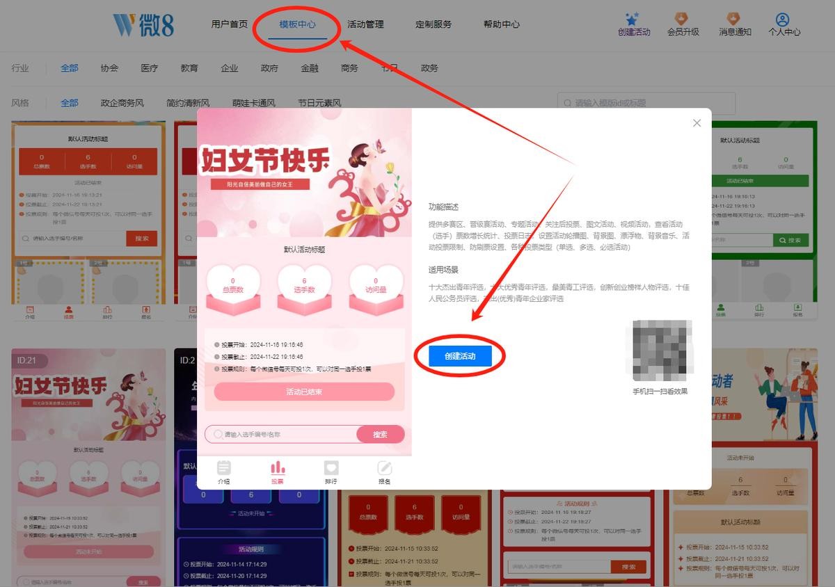 在后台点击模板中心选项,选择符合活动的模板样式后点击“创建活动”进入编辑界面。