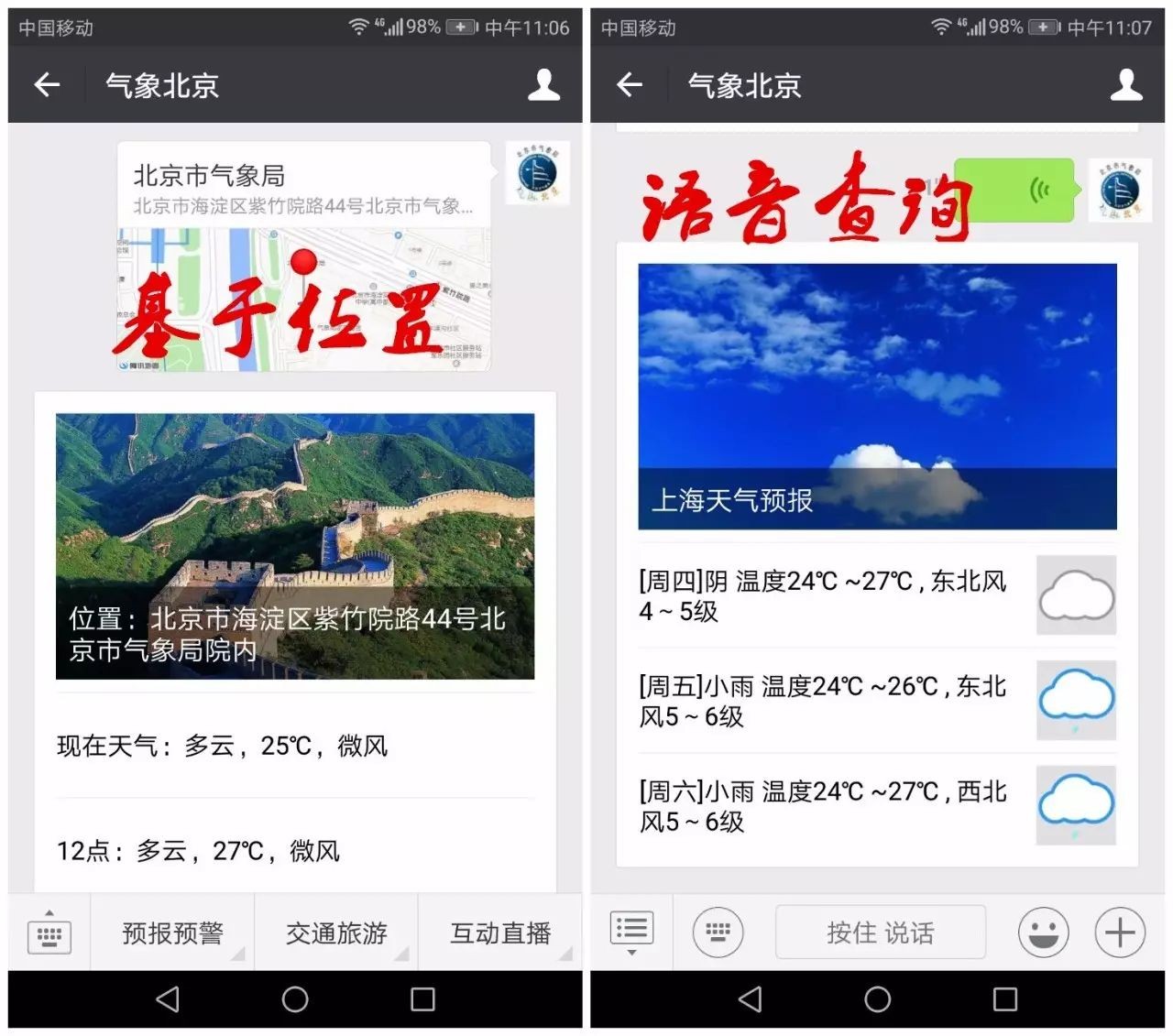 为实现智能网格预报产品在服务端的应用,有效提升公众获得感,北京市气象局决定推出基于智能网格预报的一系列公众气象服务产品。北京市气象服务中心技术保障专家穆启占介绍,新版“气象北京”微信号以旅游休闲和交通出行为落脚点,增加了旅游休闲、语音查询、地铁天气、天气小秘4个全新模块,满足京津冀一体化发展要求,提升公众气象服务满意率。