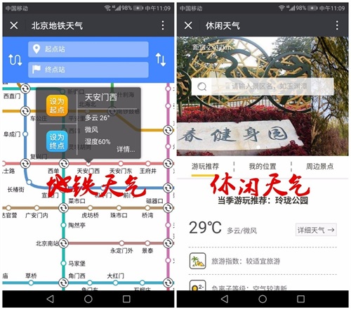 点击便可查询北京所有地铁站点当前及未来6小时的天气信息。
