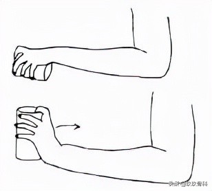 6.手腕屈曲运动:用手掌握住圆形重物0.5kg,向上弯曲手腕,慢慢降低并返回起始位置,重复10次,做3组,每组10次,随着症状改善,逐渐增加手持重物的重量致1.5kg。