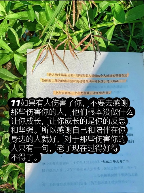11如果有人伤害了你,不要去感谢那些伤害你的人,他们根本没做什么让你成长,让你成长的是你的反思和坚强。所以感谢自己和陪伴在你身边的人就好,对于那些伤害你的人只有一句,老子现在过得好得不得了。——余华《活着》