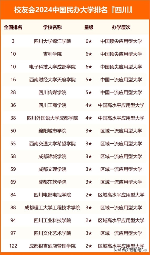 除了公办本科院校,四川的民办大学、高职院校等都有单独的类型排名,如四川民办大学排在全国前10的有三所,其中四川大学锦江学院排在最前面。