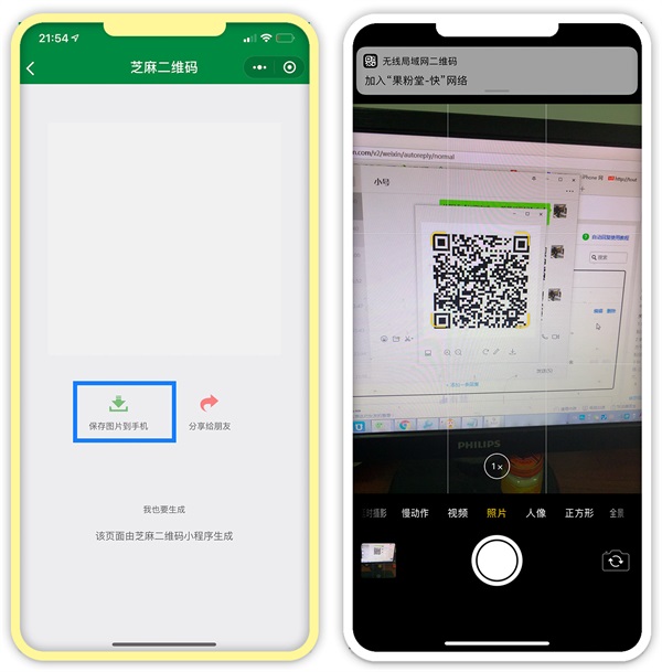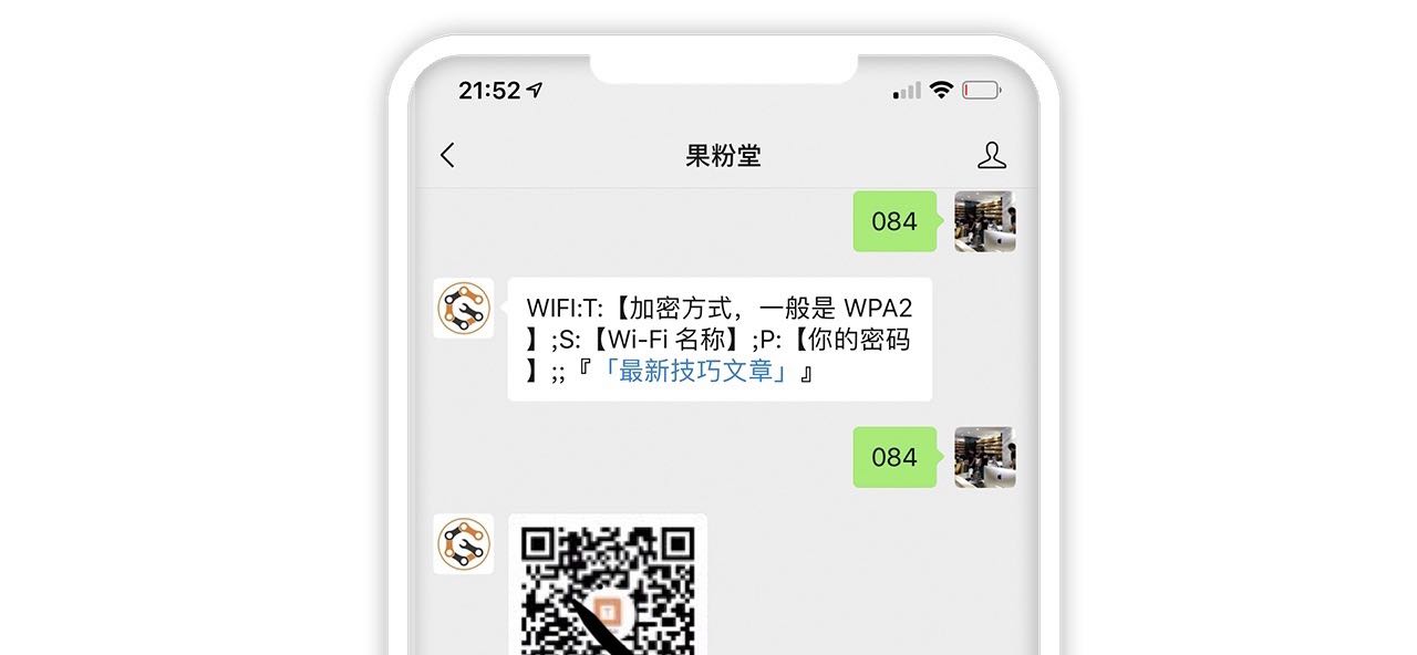 今天教大家制作WiFi二维码,只需用系统相机扫一扫就能连接,适合在家里、公司或店里等场景使用。在果粉堂对话框发送「084」,发送两次分别获得二维码和一段码。