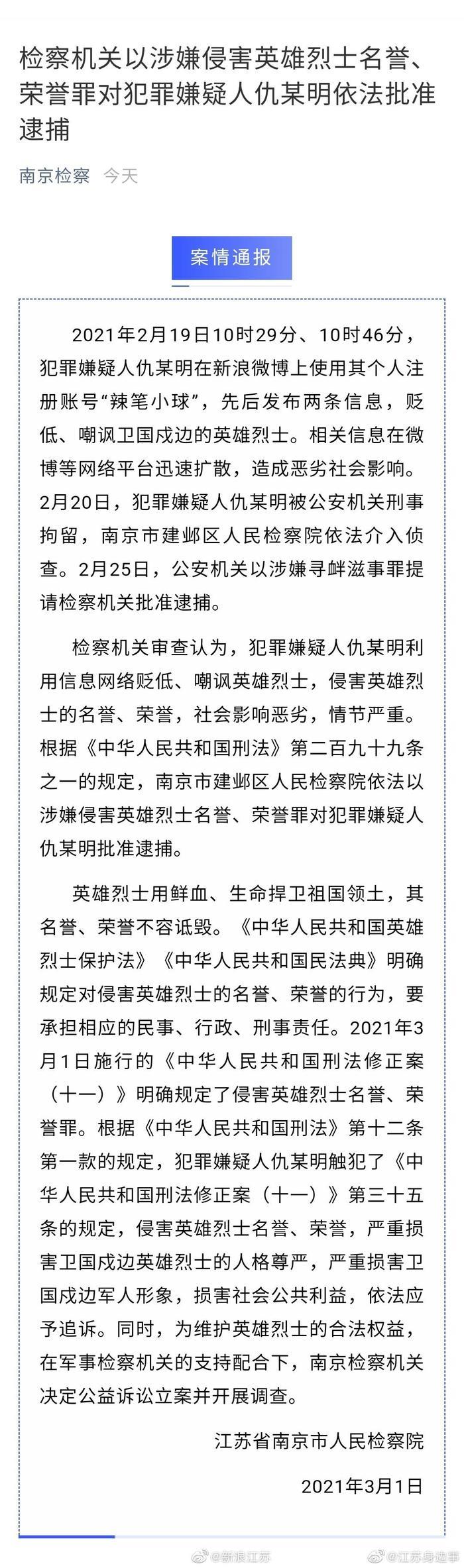 【#检察机关对辣笔小球批准逮捕##辣笔小球被批捕#】2月19日10时29分、10时46分,犯罪嫌疑人仇某明在新浪微博上使用其个人注册账号“辣笔小球”,先后发布两条信息,贬低、嘲讽卫国戍边的英雄烈士。相关信息在微博等网络平台迅速扩散,造成恶劣社会影响。2月20日,犯罪嫌疑人仇某明被公安机关刑事拘留,南京市建邺区人民检察院依法介入侦查。2月25日,公安机关以涉嫌寻衅滋事罪提请检察机关批准逮捕。#辣笔小球被南京检方批捕##南京检方通报辣笔小球案进展#