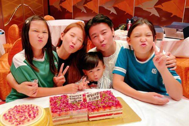 当然有一家五口一起庆生的全家福啦,张晋和蔡少芬搂着3个子女,然后一家五口都特意嘟着嘴巴合影。其中发现小儿子很像张晋,而女儿则更像妈妈蔡少芬。桌上有两个相似的蛋糕,一个是张晋送给太太,一个是3个子女送给妈妈的。