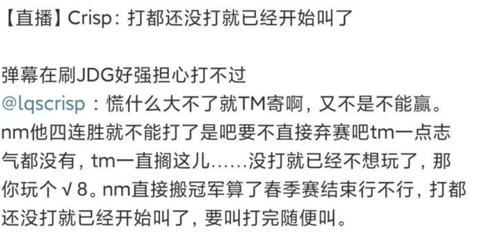 也正是因此不少其他队伍的粉丝现在的心情非常绝望,京东下场要打的是微博战队,而微博战队的粉丝本来在赛前还踌躇满志的,看完RNG比赛之后微博战队的粉丝纷纷找到官博留言,给自家官博说的是“好担心打不过京东”“京东这么强咱们怎么办”给京东官博底下留言是“打微博的时候下手能不能轻一点”。甚至有粉丝专门私信微博战队的辅助选手刘青松并在直播间里安慰他,这番举动彻底惹恼了刘青松,刘青松直播间直接开始怒喷。