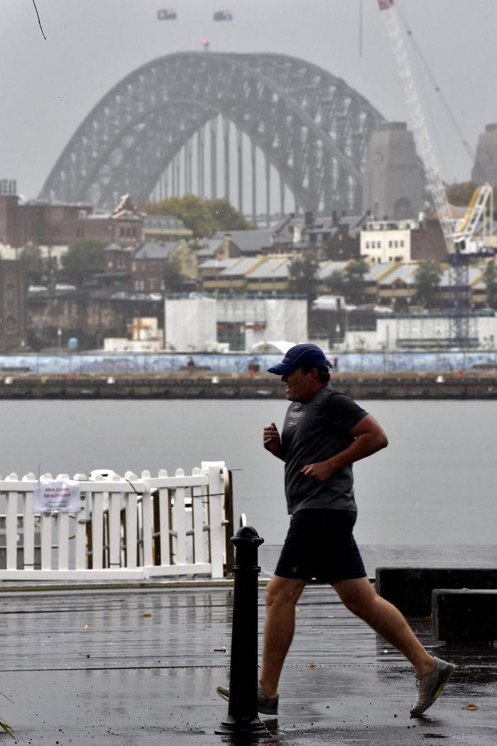 4月7日,一名男子冒雨在澳大利亚悉尼的海港大桥附近慢跑。新华社/法新