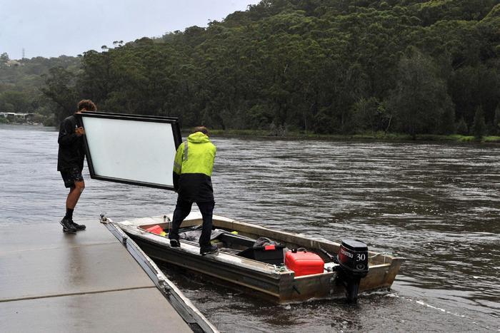 4月7日,在澳大利亚悉尼郊区,两名男子用船只运送一扇玻璃窗。新华社/法新