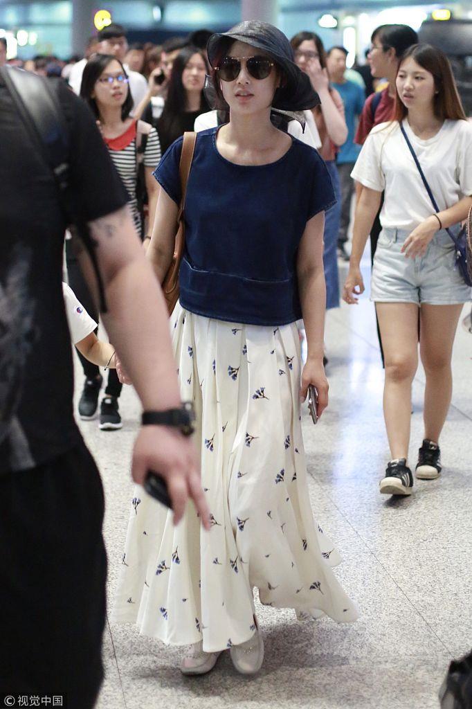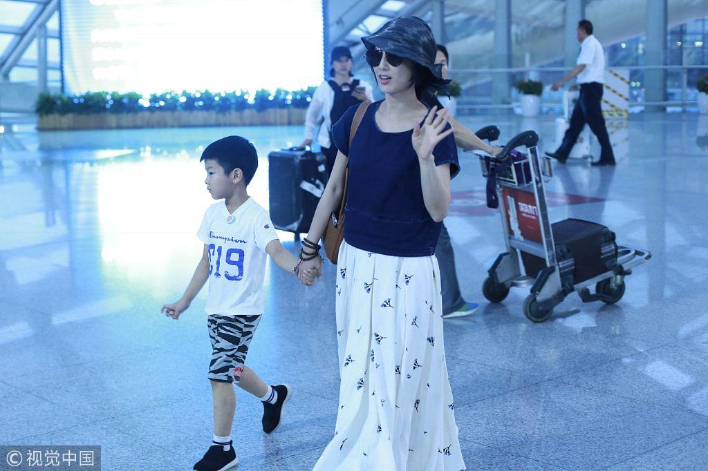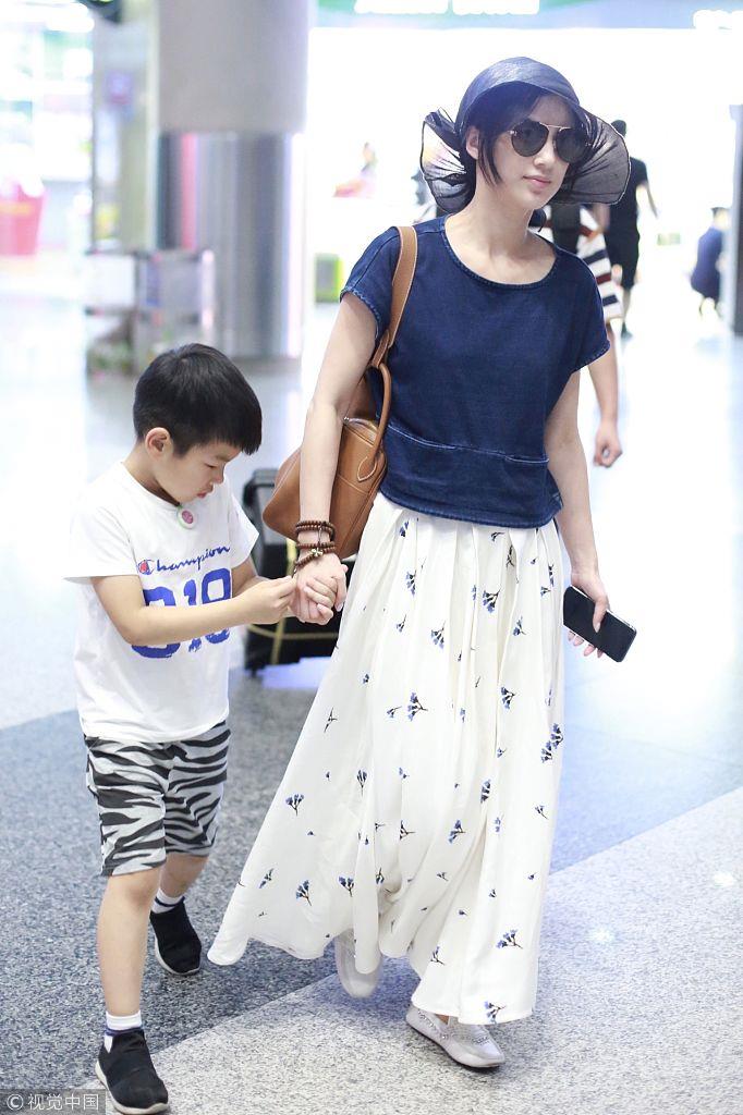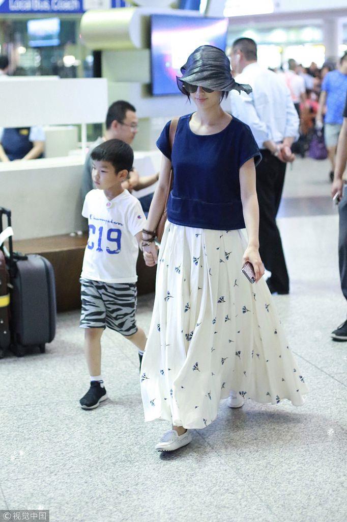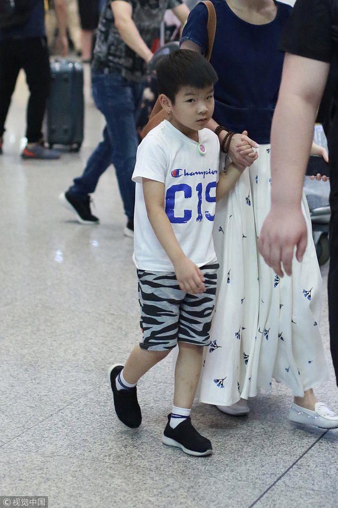 2018年7月8日,北京,黄圣依和儿子杨安迪现身机场。