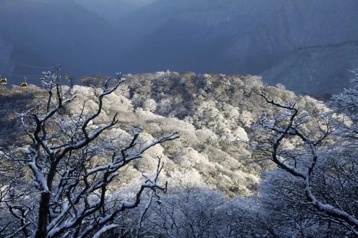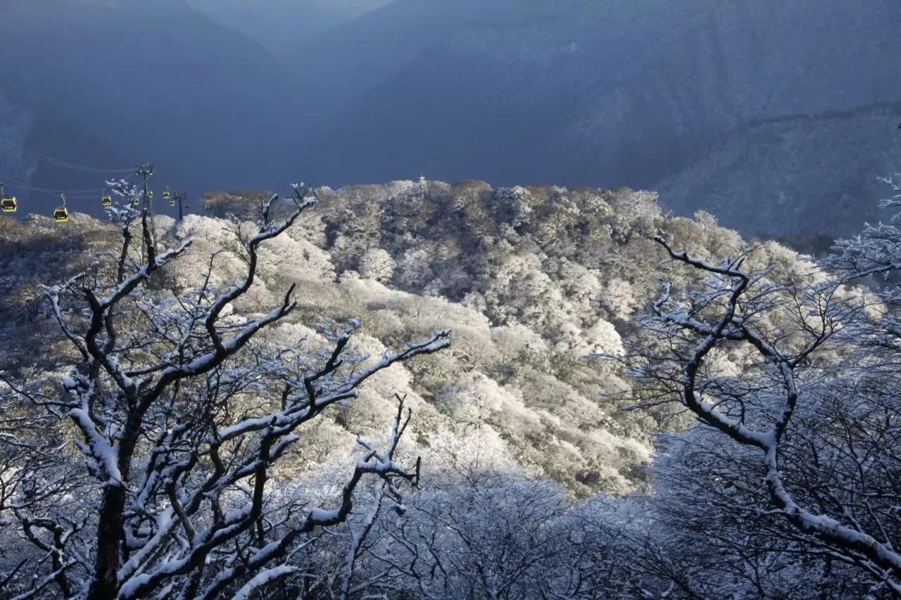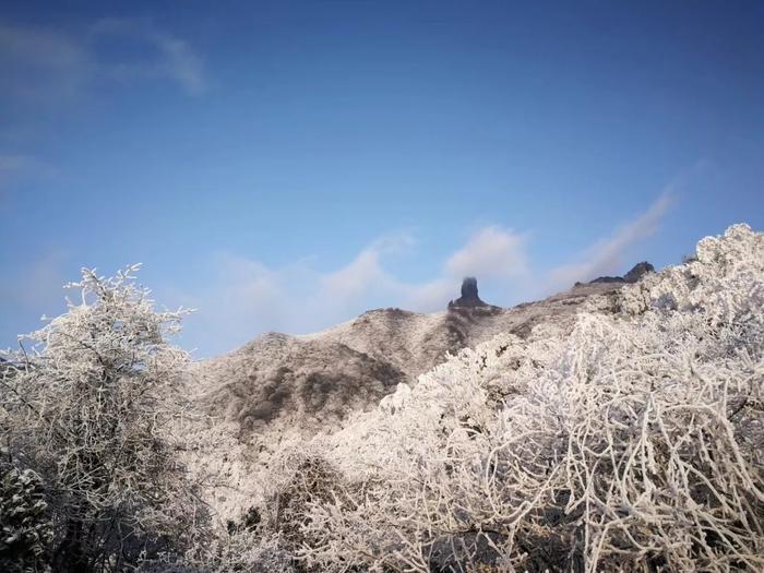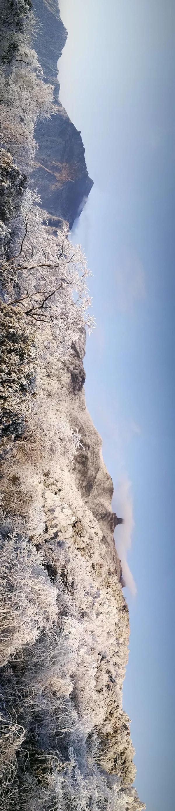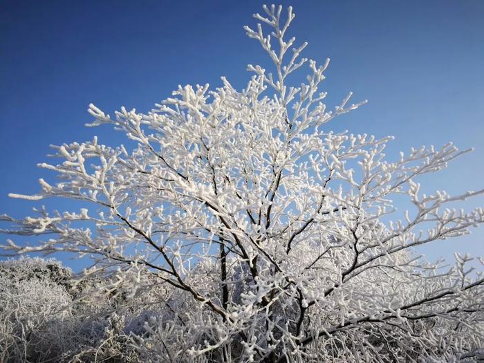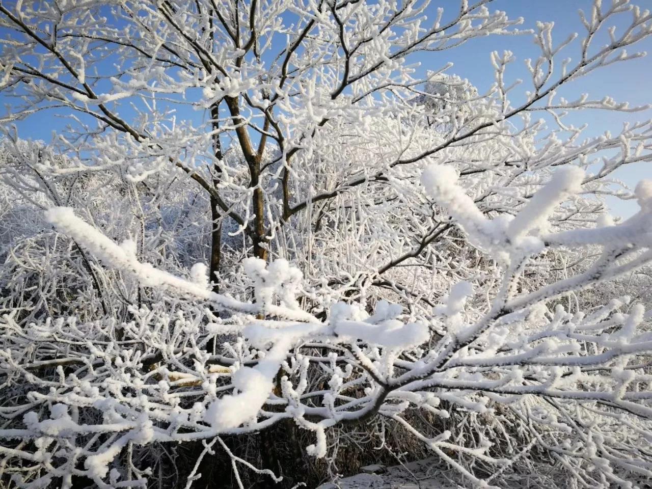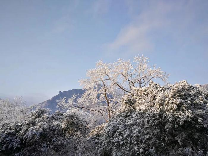 清早,当晨光揭开雾霭的纱幔时,山林裹素,松柳银装,山风吹得枝头闪烁,那是南方难得一见地雾凇。