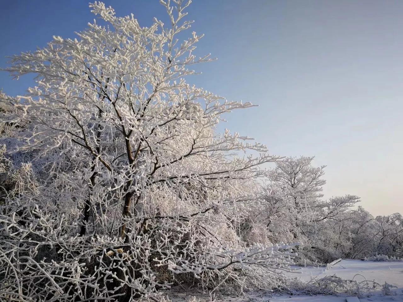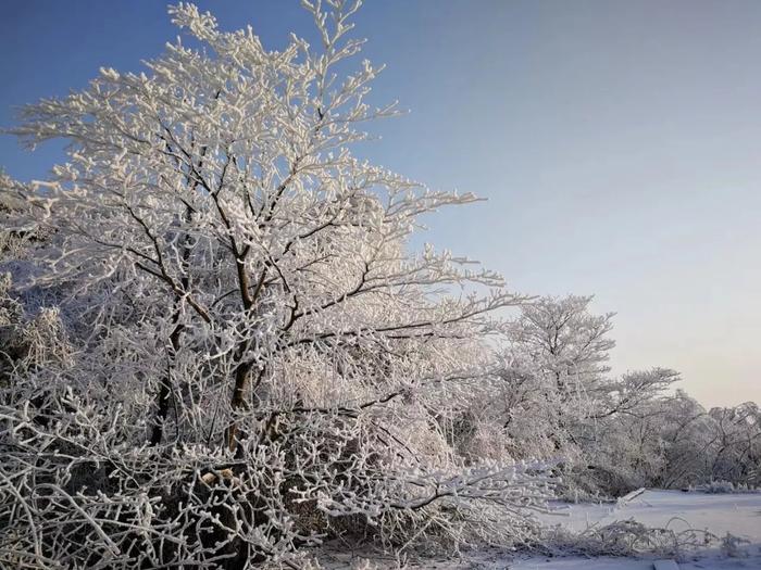 蓝天如洗,万里晴空,在薄雾环绕中,若能在这林间走上一走,抖落一身雪粉,把山间填满欢声笑语。或是什么都不做,闲看雾凇雪林,玉披群山。