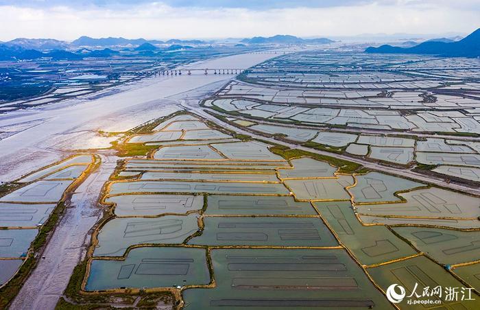 空中俯瞰台州市三门县万亩养殖塘,美景如画。人民网 章勇涛摄
