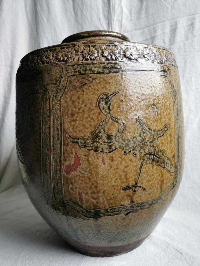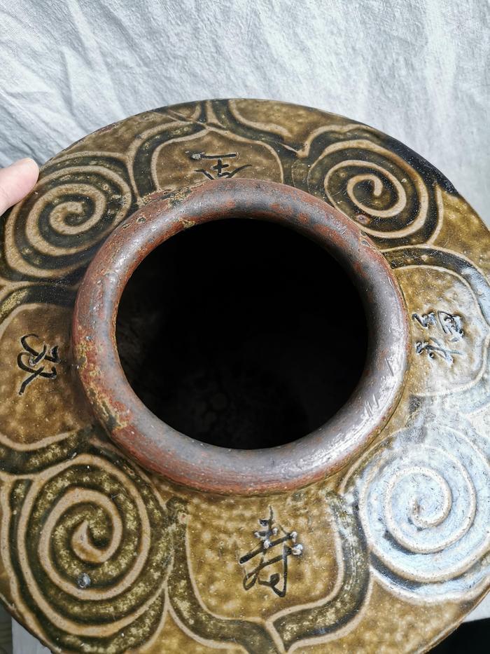 清代早期马口窑“福寿双全”花鸟纹大罐,罐高40厘米,口径13厘米,足径18厘米。器外施酱褐色青釉,有开片,内壁无釉。肩部阴刻旋涡纹,肩腹转折处辅以小花组成二方连续纹样,腹部开窗内阴刻花鸟图。