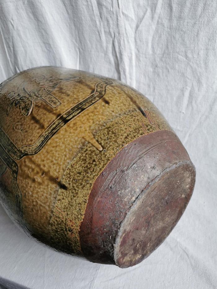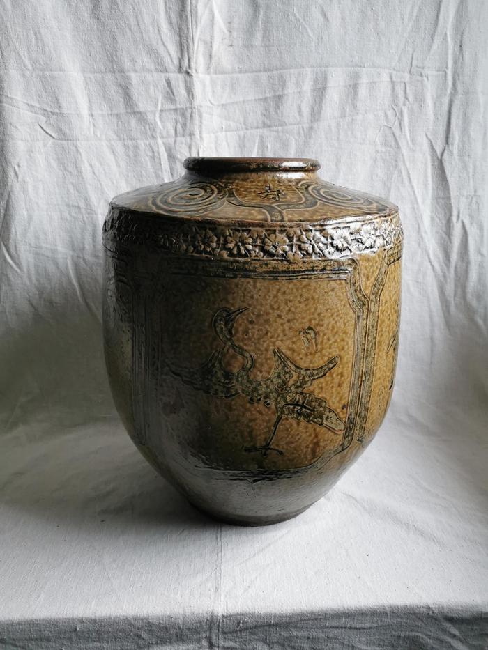 此件马口窑大罐造型较为规整,胎壁厚重,近底部处无釉露紫红色胎。通体阴刻花鸟图,刀工犀利,线条流畅奔放。特别是在肩部旋纹中等距离至左向右阴刻“福寿双全”四字。据此分析福寿双全大罐可能是用以盛酒的容器。