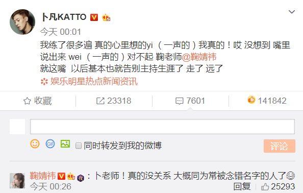 31日,卜凡在微博发文,为念错鞠婧祎名字道歉:“我练了很多遍,真的心里想的yi(一声的)我真的!哎,没想到,嘴里说出来wei(一声的)对不起,鞠老师@鞠婧祎,就这嘴 ,以后基本也就告别主持生涯了,走了,远了 。”